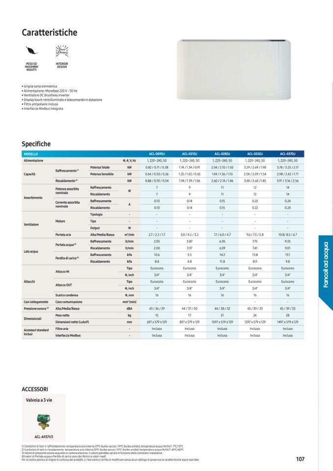 1) Condizioni di test in raffreddamento: temperatura aria interna 27°C (bulbo secco) / 19°C (bulbo umido); temperatura acqua IN/OUT: 7°C/12°C