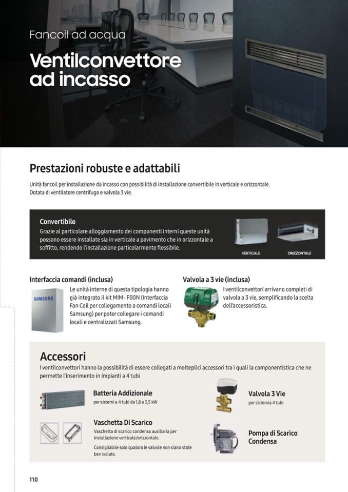 Unità fancoil per installazione da incasso con possibilità di installazione convertibile in verticale e orizzontale.