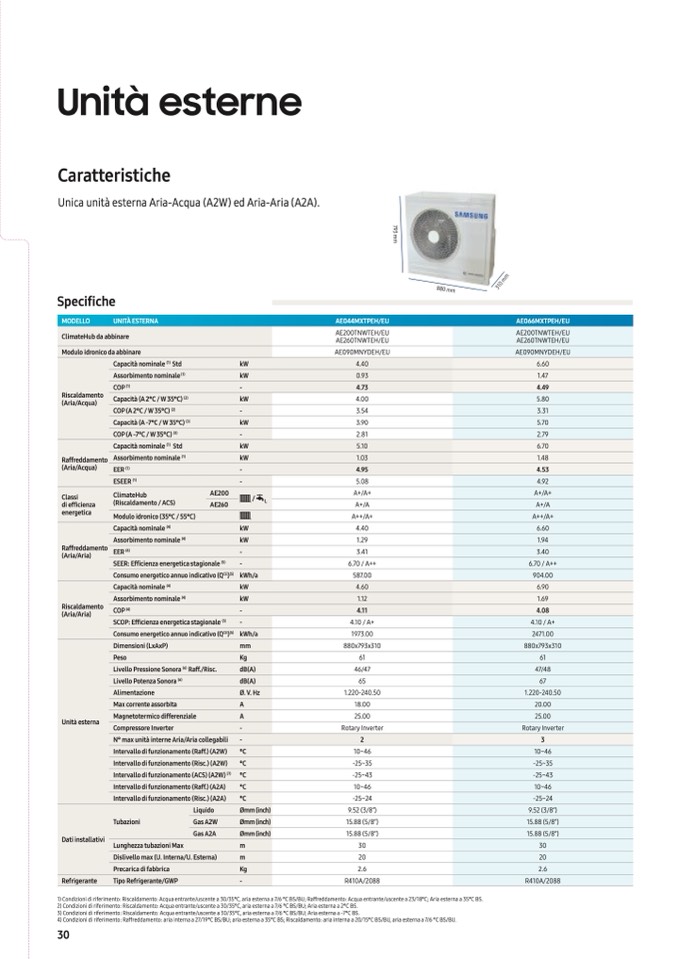 2) Condizioni di riferimento: Riscaldamento: Acqua entrante/uscente a 30/35°C, aria esterna a 7/6 °C BS/BU; Aria esterna a 2°C BS.