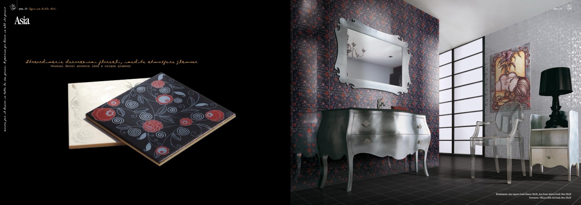 Rivestimento: Asia Argento fondo Bianco 20x20_Asia Rosso Selenio fondo Nero 20x20
