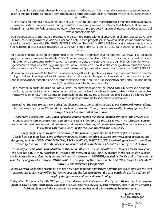 Today Mamoli is part of the FRANKE group, with a shared participation from Paini group. We have kept our original