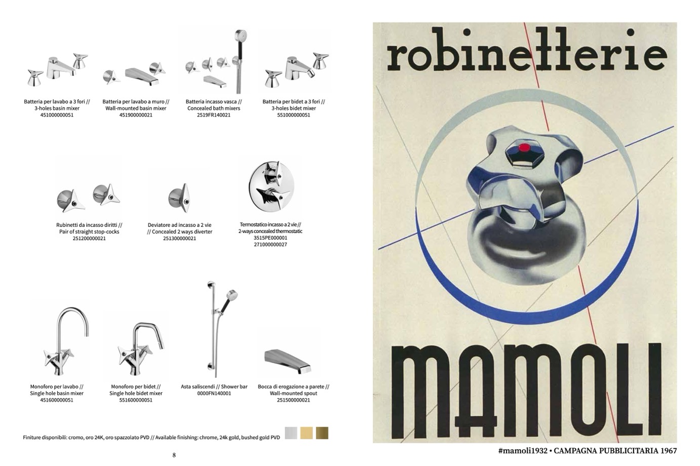 Finiture disponibili: cromo, oro 24K, oro spazzolato PVD // Available finishing: chrome, 24k gold, bushed gold PVD