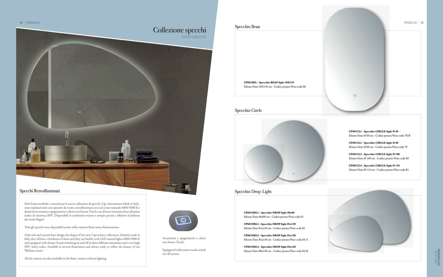 Italy, they all have a thickness of 4mm and they are backlit with LED natural lights 4000/5000 K