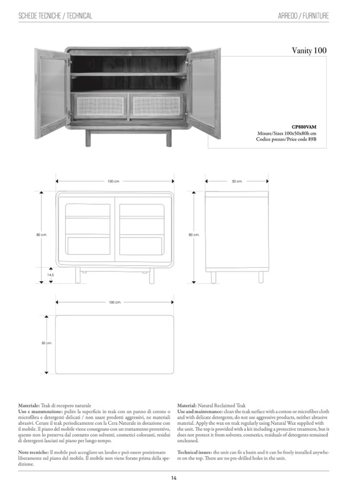Uso e manutenzione: pulire la superficie in teak con un panno di cotone o