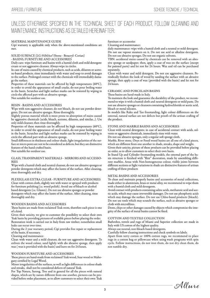 Daily care: wipe furniture and basins with a humid cloth and mild detergent