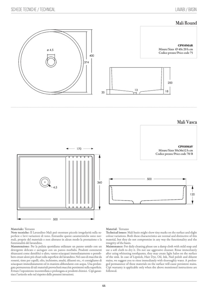 Note tecniche: Il Lavandino Mali può mostrare piccole irregolarità sulla su-