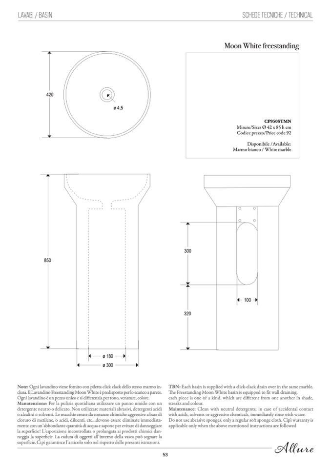 Note: Ogni lavandino viene fornito con piletta click clack dello stesso marmo in-