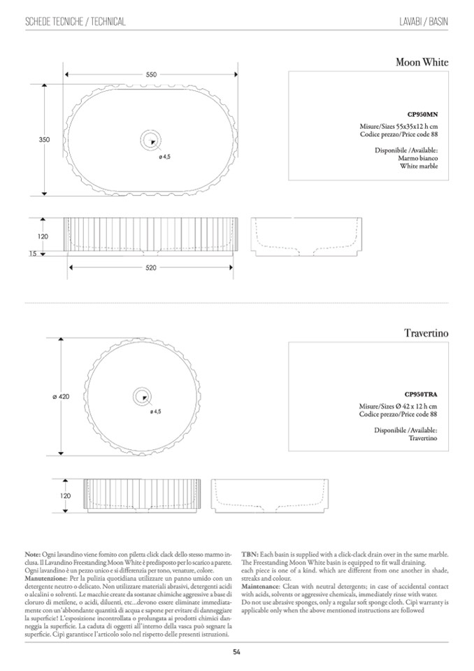 Note: Ogni lavandino viene fornito con piletta click clack dello stesso marmo in-