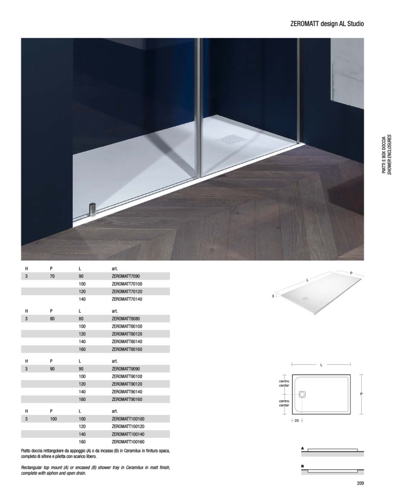 Piatto doccia rettangolare da appoggio (A) o da incasso (B) in Ceramilux in finitura opaca,