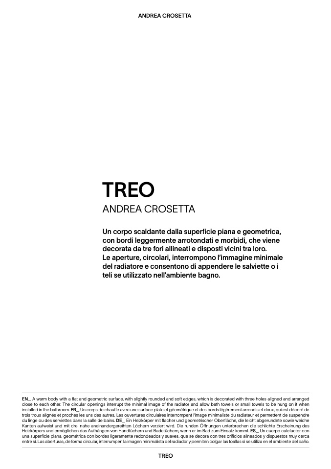 installed in the bathroom. FR_ Un corps de chauffe avec une surface plate et géométrique et des bords légèrement arrondis et doux, qui est décoré de
