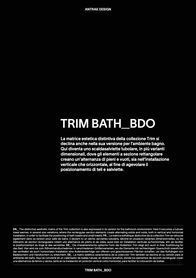 EN_ The distinctive aesthetic matrix of the Trim collection is also expressed in its version for the bathroom environment. Here it becomes a tubular
