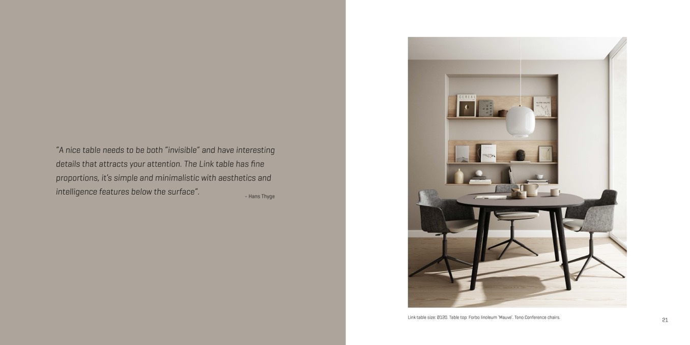 Link table size: Ø120. Table top: Forbo linoleum ’Mauve’. Tono Conference chairs.