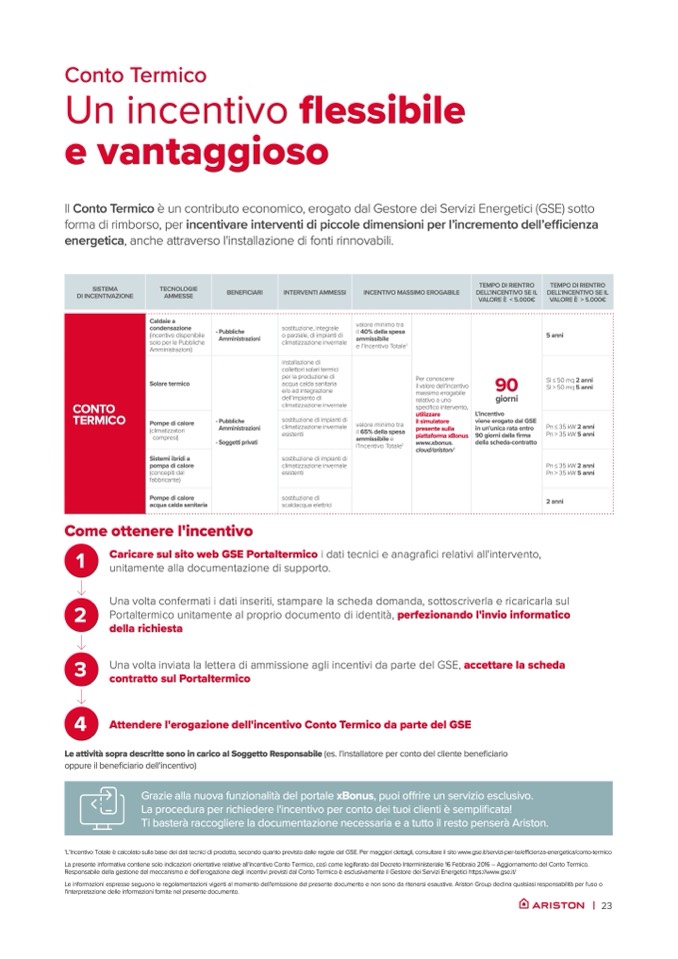 L’Incentivo Totale è calcolato sulla base dei dati tecnici di prodotto, secondo quanto previsto dalle regole del GSE. Per maggiori dettagli, consultare il sito www.gse.it/servizi-per-te/efficienza-energetica/conto-termico