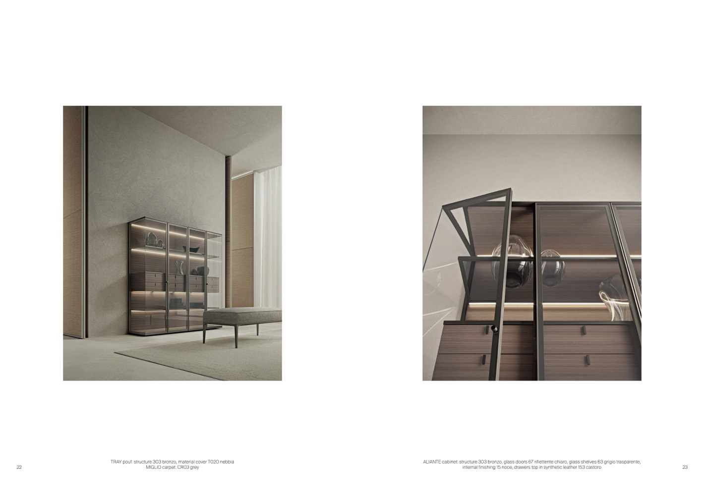 ALIANTE cabinet: structure 303 bronzo, glass doors 67 riflettente chiaro, glass shelves 63 grigio trasparente,