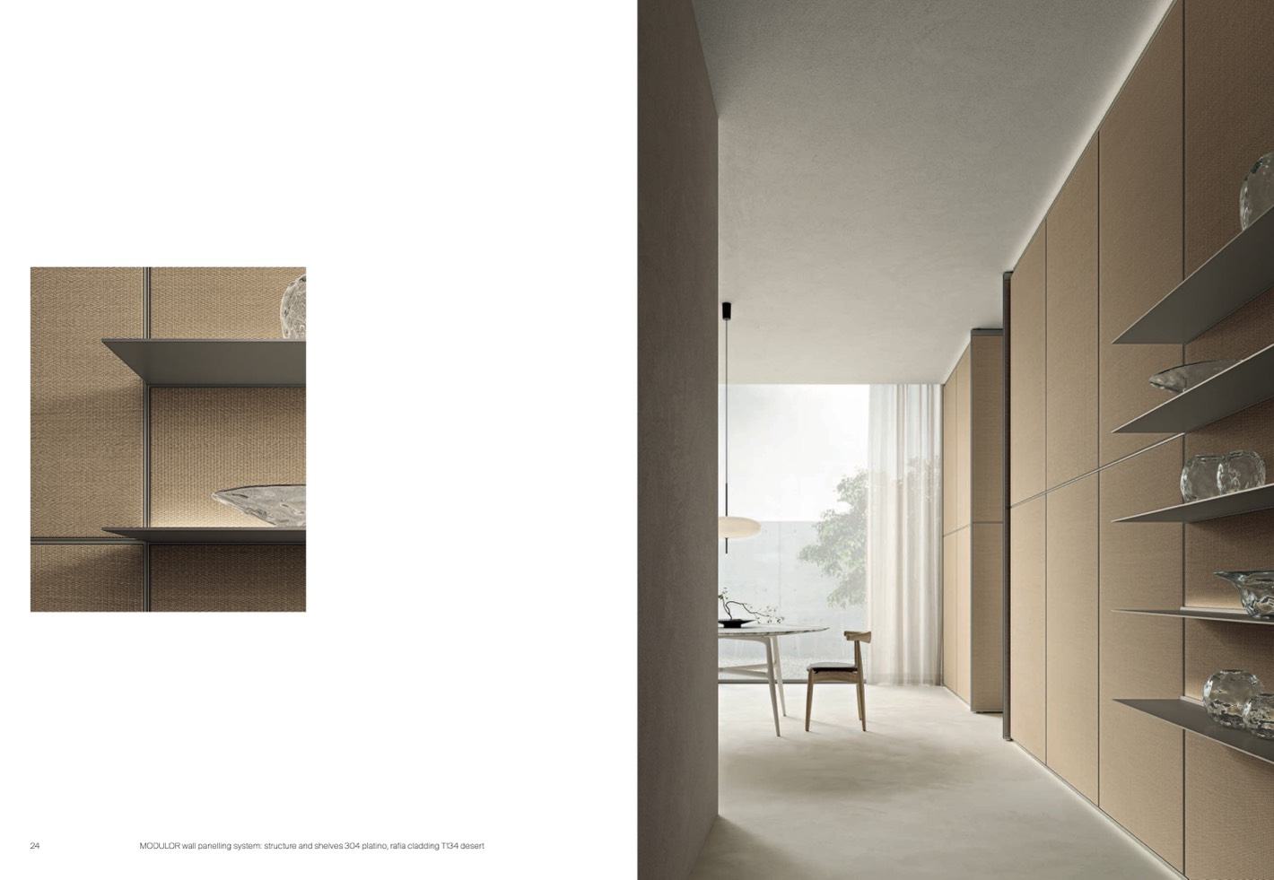MODULOR wall panelling system: structure and shelves 304 platino, rafia cladding T134 desert