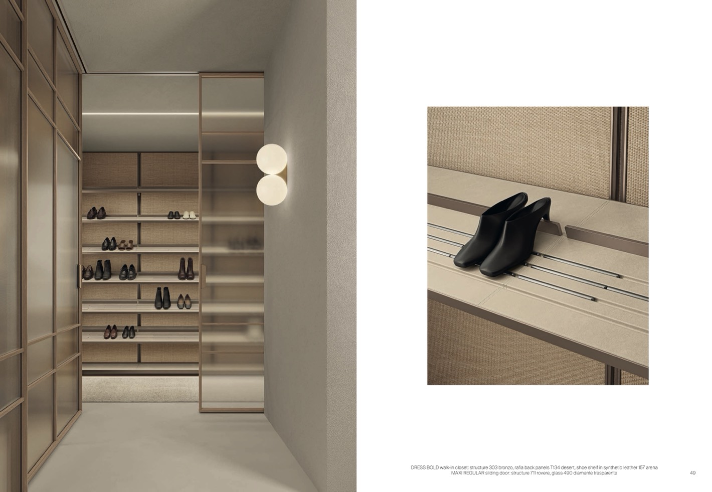 DRESS BOLD walk-in closet: structure 303 bronzo, rafia back panels T134 desert, shoe shelf in synthetic leather 157 arena