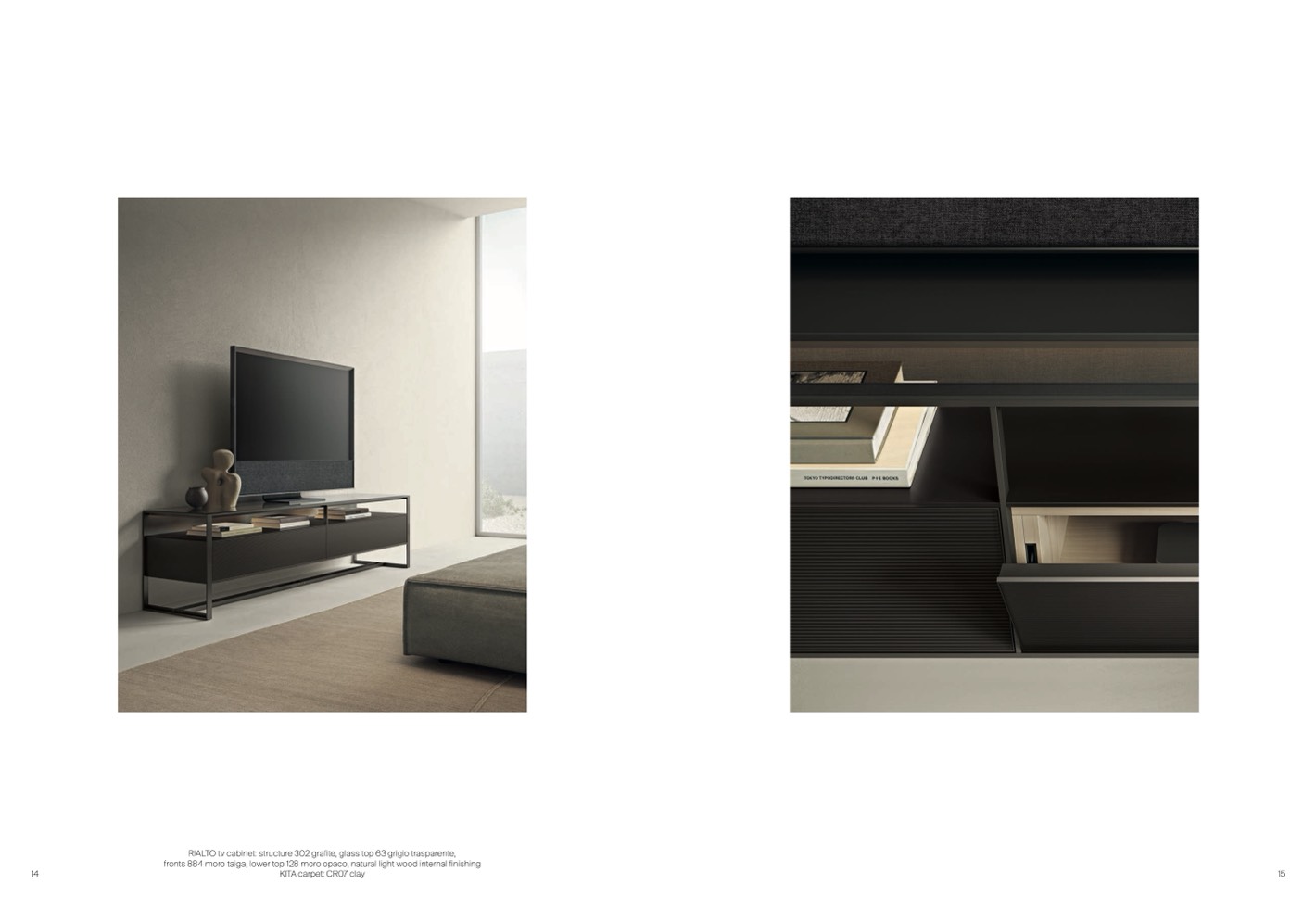 RIALTO tv cabinet: structure 302 grafite, glass top 63 grigio trasparente,