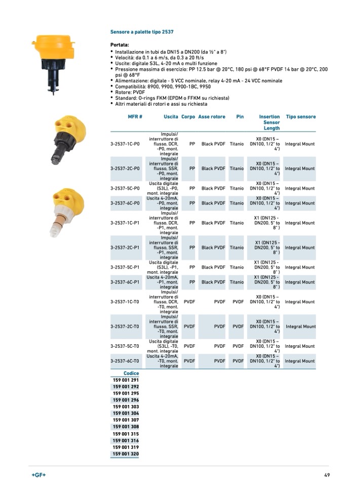 • Pressione massima di esercizio: PP 12.5 bar @ 20°C, 180 psi @ 68°F PVDF 14 bar @ 20°C, 20