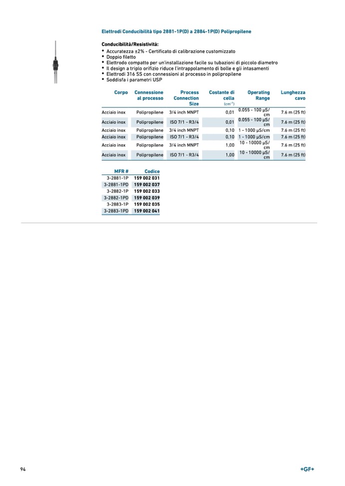 • Elettrodi 316 SS con connessioni al processo in polipropilene