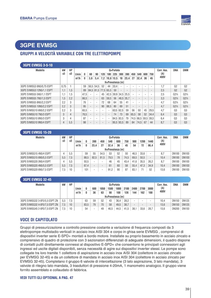 per EVMSG 32-45) e da un collettore di mandata in acciaio inox AISI 304 (collettore in acciaio zincato per