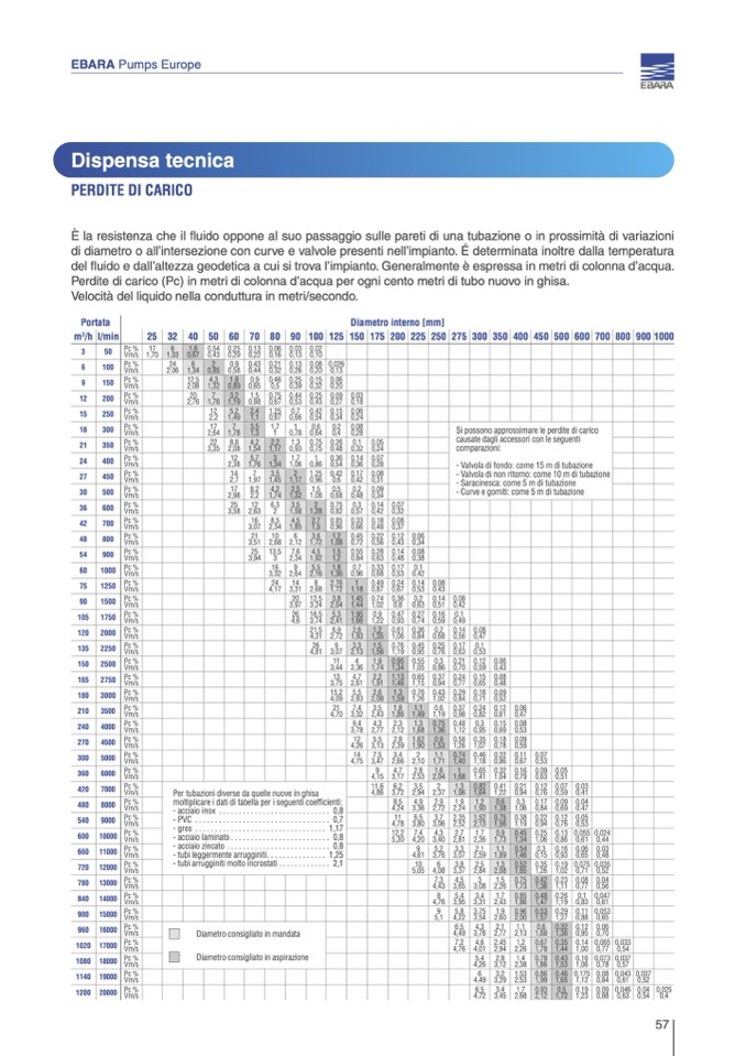 Perdite di carico (Pc) in metri di colonna d’acqua per ogni cento metri di tubo nuovo in ghisa.