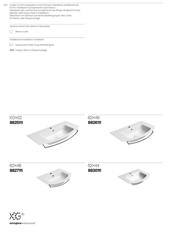 250 Lavabo con foro troppopieno e monoforo per rubinetteria, predisposto per