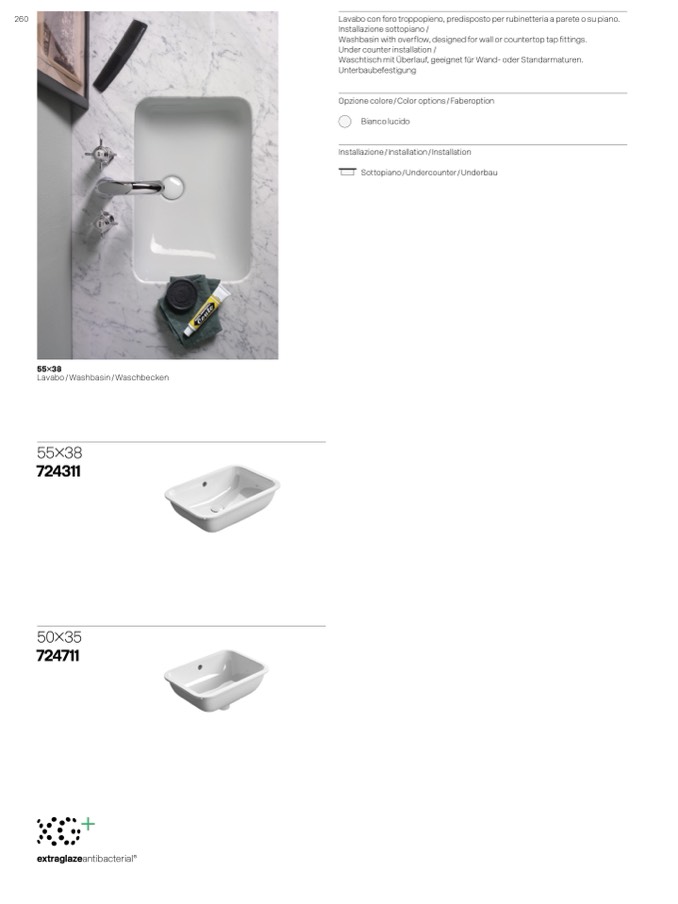 Lavabo con foro troppopieno, predisposto per rubinetteria a parete o su piano.
