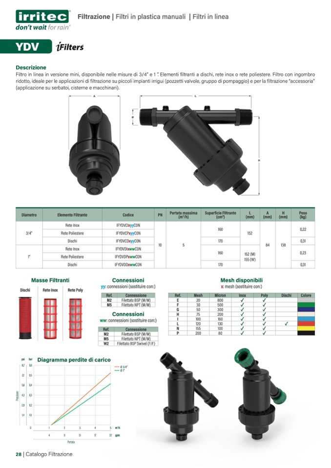 Filtro in linea in versione mini, disponibile nelle misure di 3/4” e 1 ‘.’ Elementi filtranti a dischi, rete inox o rete poliestere. Filtro con ingombro
