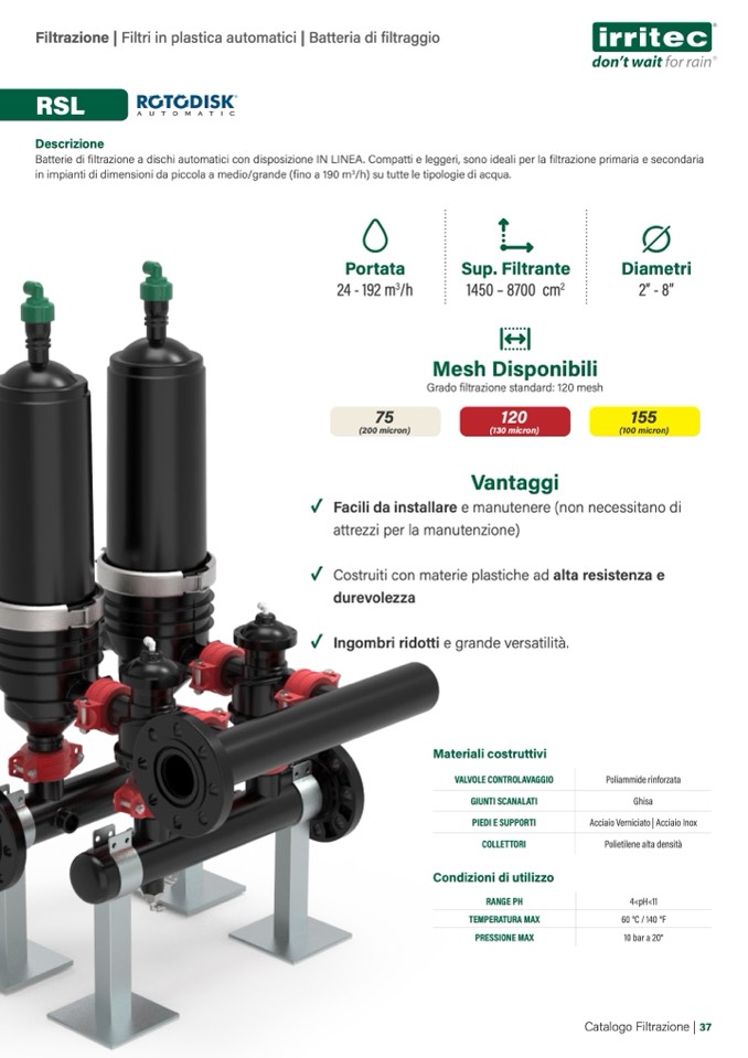 Batterie di filtrazione a dischi automatici con disposizione IN LINEA. Compatti e leggeri, sono ideali per la filtrazione primaria e secondaria
