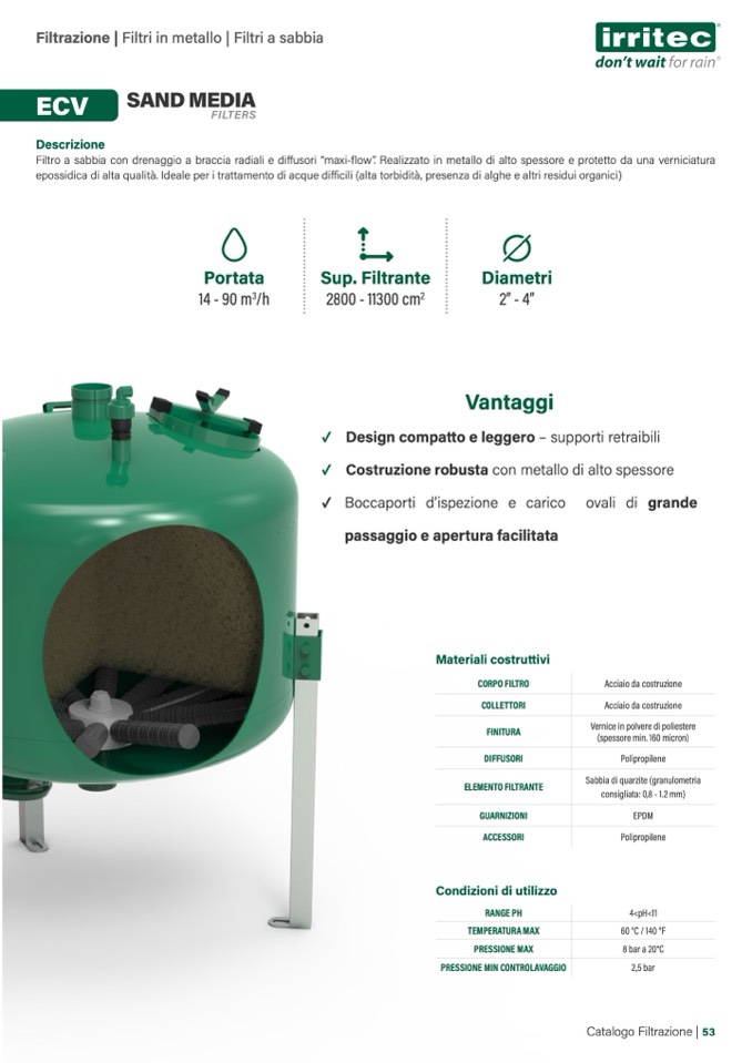 Filtro a sabbia con drenaggio a braccia radiali e di