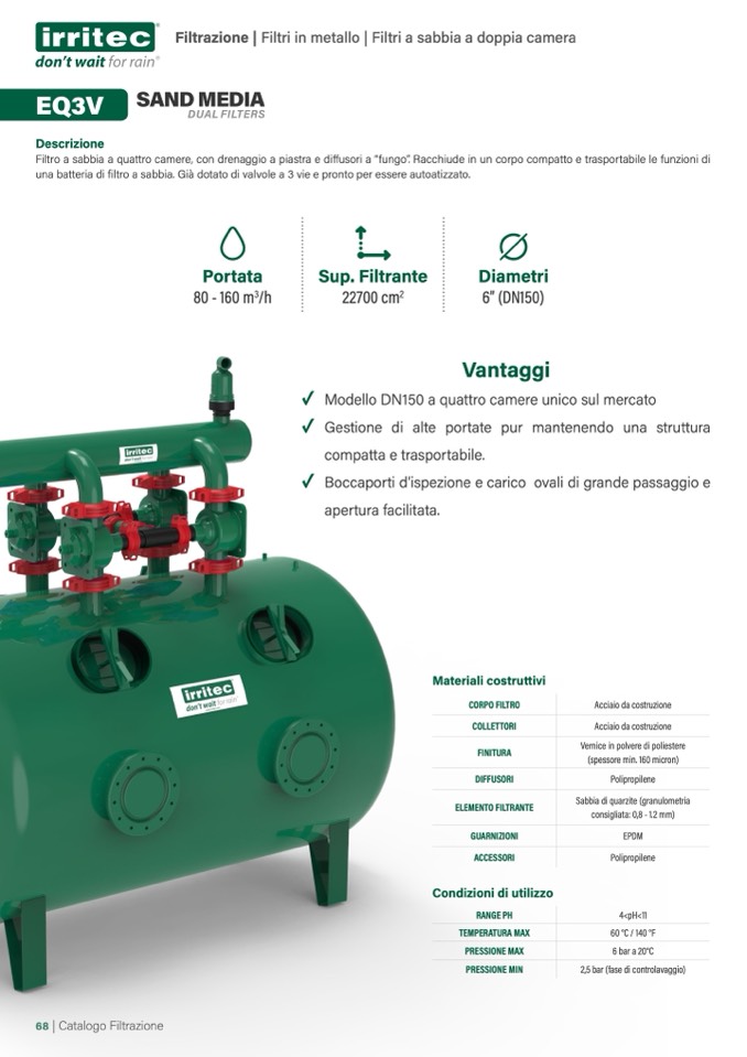 Filtro a sabbia a quattro camere, con drenaggio a piastra e diffusori a “fungo”. Racchiude in un corpo compatto e trasportabile le funzioni di