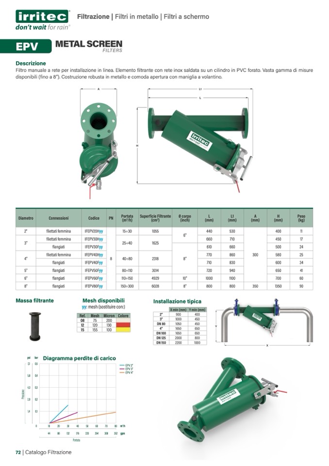 Filtro manuale a rete per installazione in linea. Elemento filtrante con rete inox saldata su un cilindro in PVC forato. Vasta gamma di misure