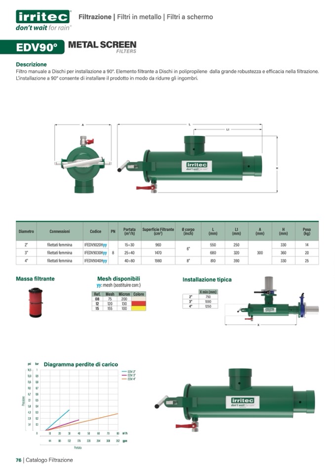 Filtro manuale a Dischi per installazione a 90°. Elemento filtrante a Dischi in polipropilene dalla grande robustezza e efficacia nella filtrazione.