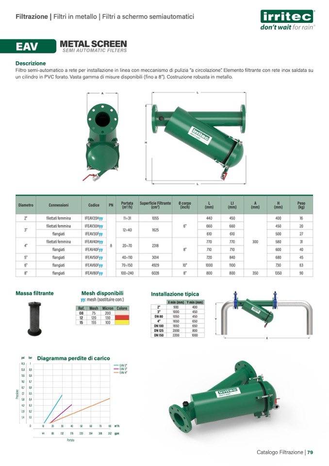 Filtro semi-automatico a rete per installazione in linea con meccanismo di pulizia “a circolazione”. Elemento filtrante con rete inox saldata su