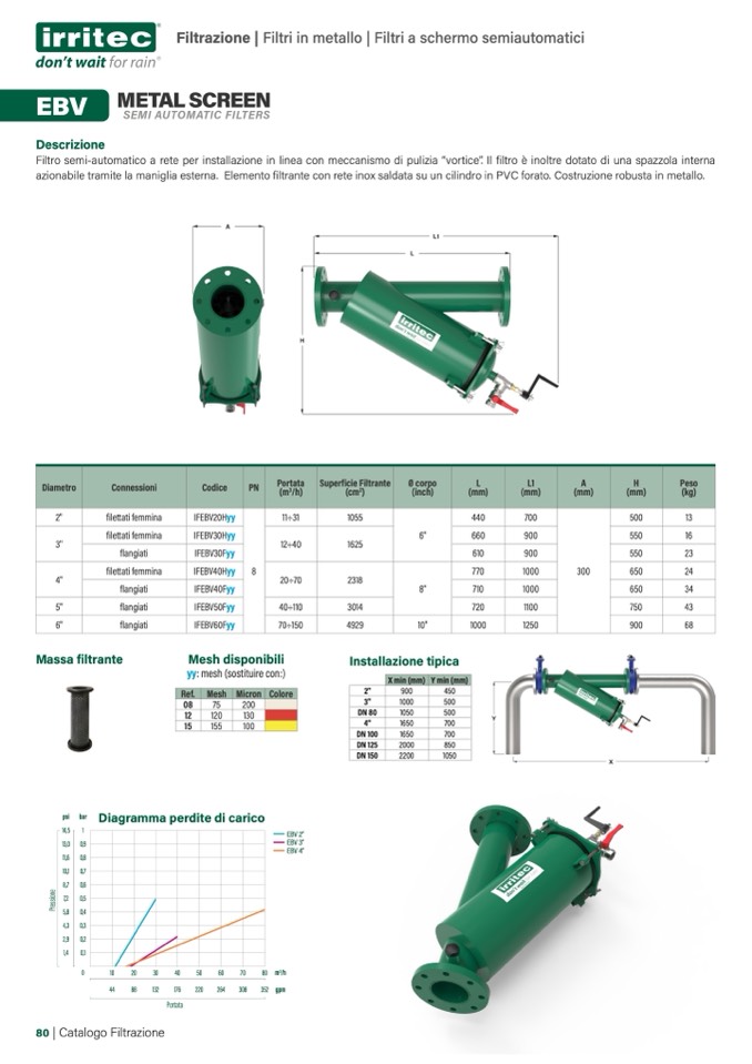 azionabile tramite la maniglia esterna. Elemento filtrante con rete inox saldata su un cilindro in PVC forato. Costruzione robusta in metallo.