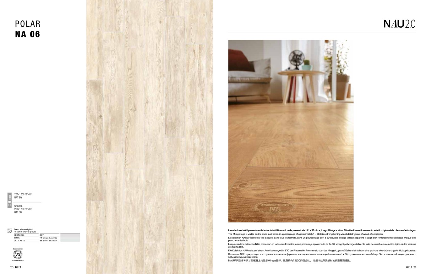 La collezione NAU presenta sulle lastre in tutti i formati, nella percentuale di 1 a 30 circa, il logo Mirage a vista. Si tratta di un rafforzamento estetico tipico delle plance effetto legno