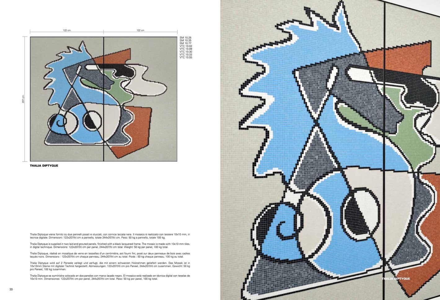 Thalia Diptyque, réalisé en mosaïque de verre en tesselles d’un centimètre, est fourni fini, posé sur deux panneaux de bois avec cadres