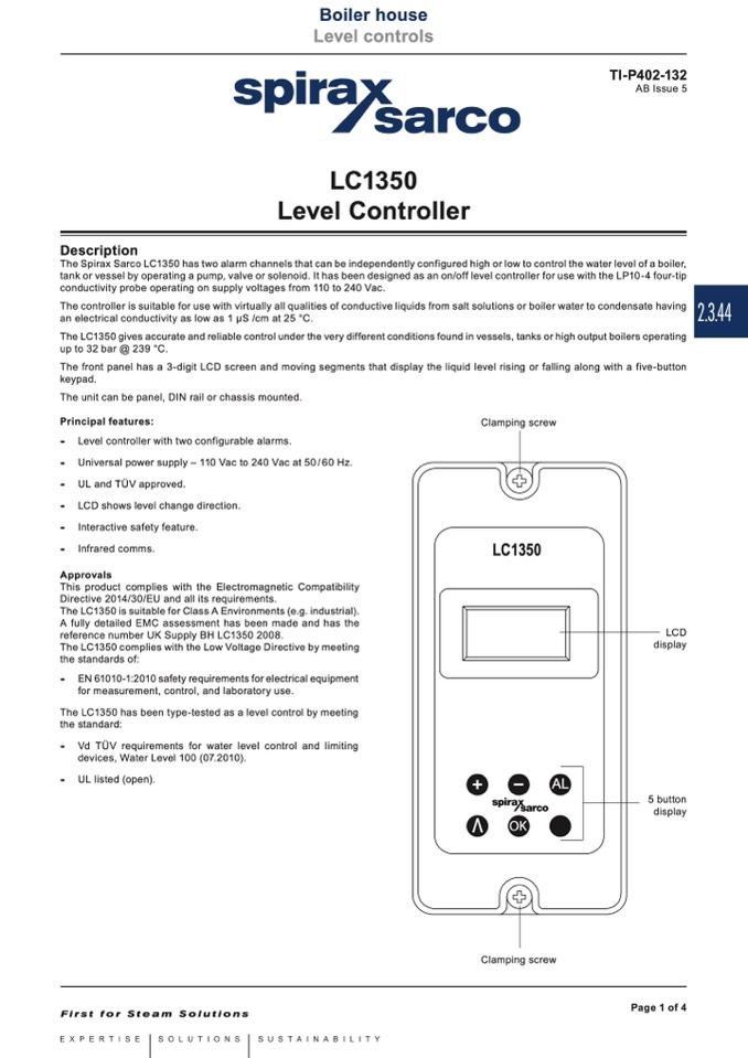 The Spirax Sarco LC1350 has two alarm channels that can be independently configured high or low to control the water level of a boiler,