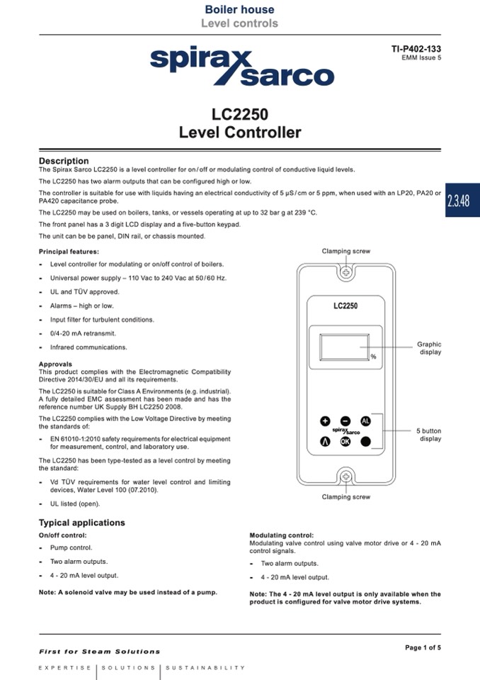 The Spirax Sarco LC2250 is a level controller for on/off or modulating control of conductive liquid levels.