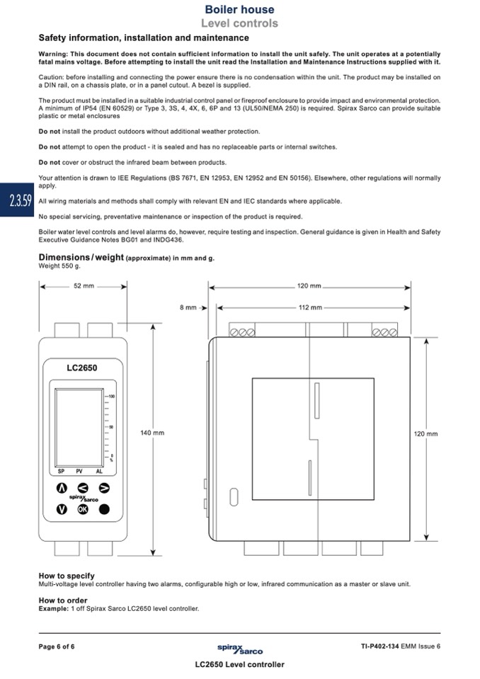 Example: 1 off Spirax Sarco LC2650 level controller.