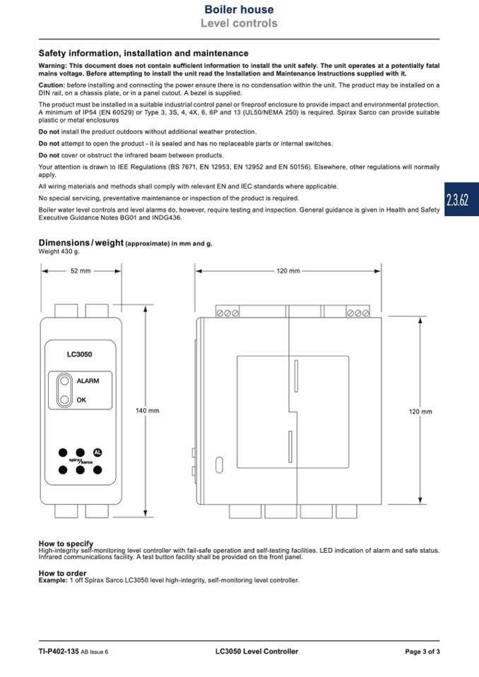Example: 1 off Spirax Sarco LC3050 level high-integrity, self-monitoring level controller.
