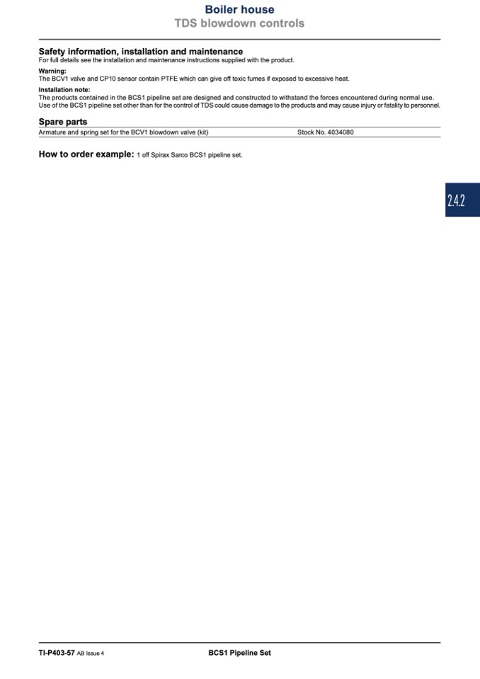 Use of the BCS1 pipeline set other than for the control of TDS could cause damage to the products and may cause injury or fatality to personnel.
