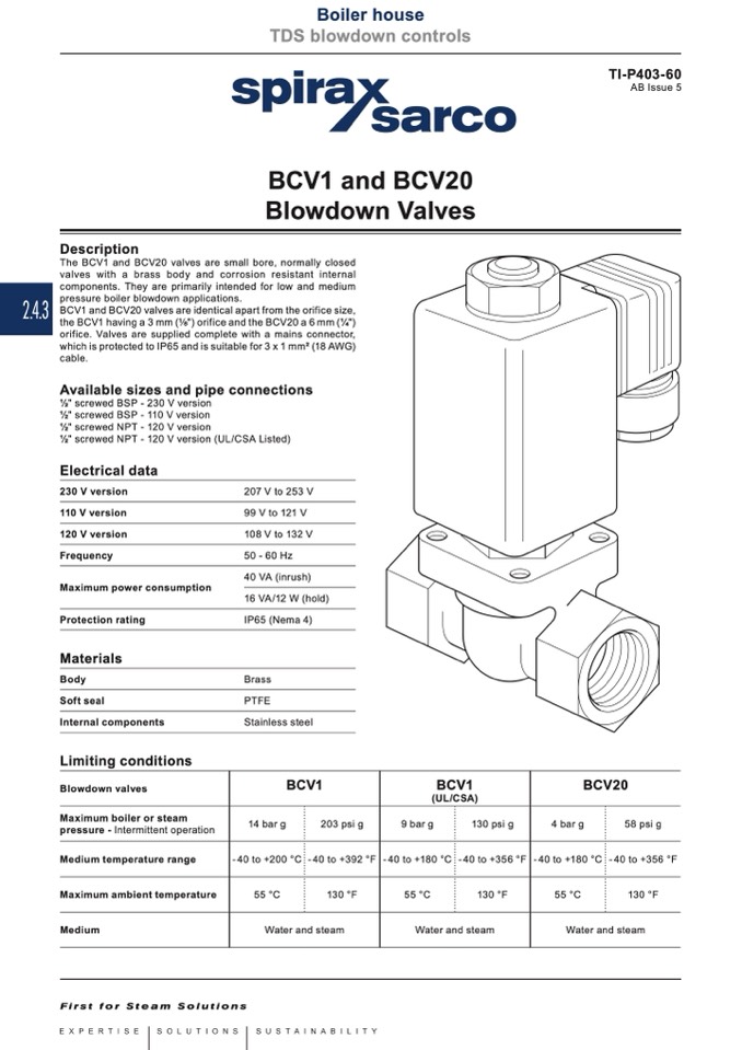 The BCV1 and BCV20 valves are small bore, normally closed