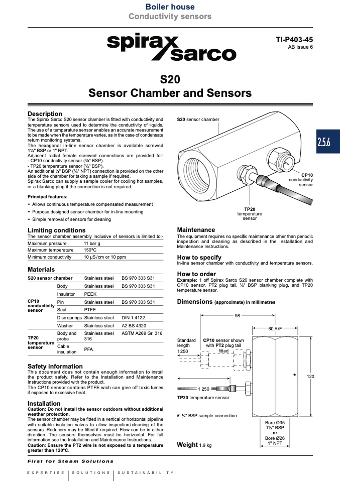 The Spirax Sarco S20 sensor chamber is fitted with conductivity and