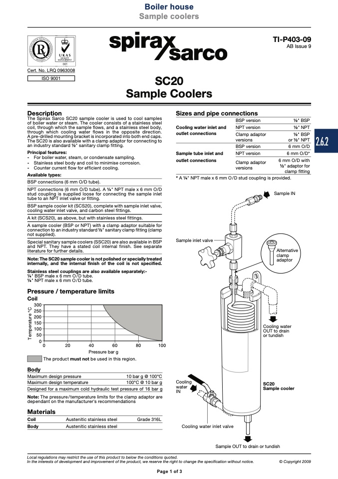 The Spirax Sarco SC20 sample cooler is used to cool samples