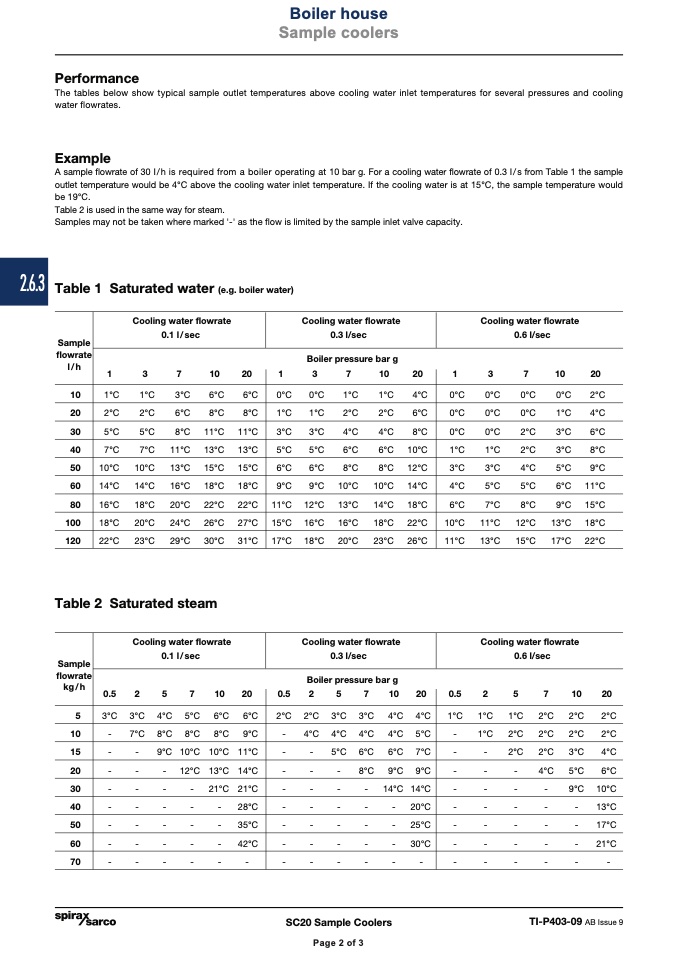 A sample flowrate of 30 I/h is required from a boiler operating at 10 bar g. For a cooling water flowrate of 0.3 I/s from Table 1 the sample
