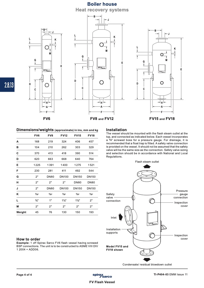 Example: 1 off Spirax Sarco FV6 flash vessel having screwed