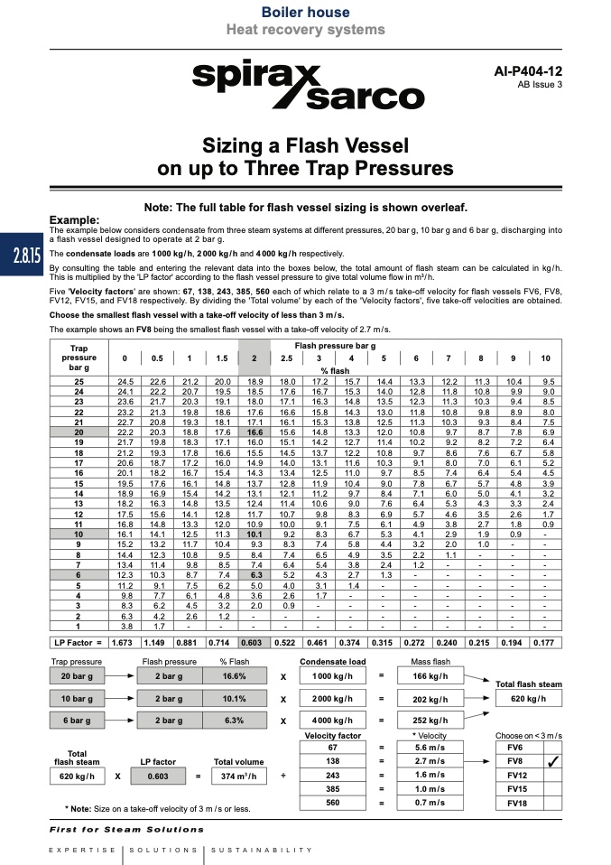 The example below considers condensate from three steam systems at different pressures, 20 bar g, 10 bar g and 6 bar g, discharging into
