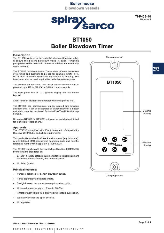 The BT1050 is a timer for the control of a bottom blowdown valve.