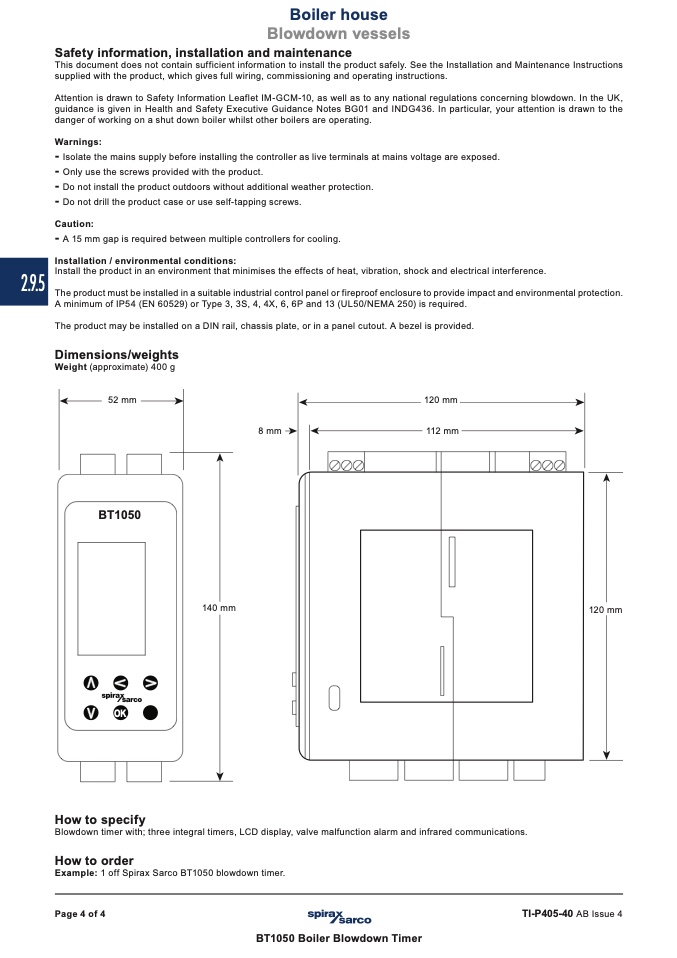 Example: 1 off Spirax Sarco BT1050 blowdown timer.